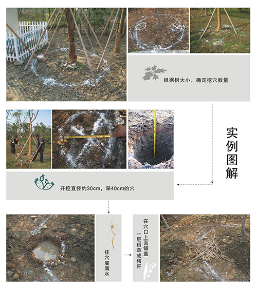 在樹冠滴水線(垂直投影輪廓線)附近開挖直徑約30cm,深40~60cm的穴(沙質(zhì)土宜淺,黏質(zhì)土宜深,但以不傷樹根為佳),穴的數(shù)量依樹大小而定(如Φ<10cm挖2個穴,10cm≤Φ<20 cm 挖3~4個穴,20cm≤Φ<40 cm挖6~8個穴),然后往穴內(nèi)灌滿水,最后在穴口上面鋪蓋一層稻草或秸稈,以減少水分蒸發(fā)損耗,進(jìn)行抗旱時直接往穴內(nèi)灌水即可。