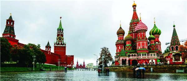 左為紅場(chǎng)警報(bào)大鼓鐘塔樓與斯帕斯(救世主)塔樓,右為圣瓦西里大教堂
