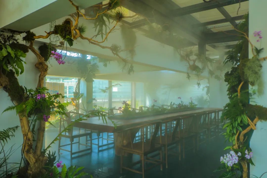參會的專家顧問及副主任委員們還參觀了人文園林位于屋頂的花園。雖然杭州進入了炎熱的夏季,但花園內依然綠意盎然,行走在其間仿佛置身于雨林中。這里同時作為植物品種收集種植觀測區,現已種植植物品種約400多種,其中包括睡蓮、鳶尾、蘭花、杜鵑、紫藤等人文園林特色植物。
